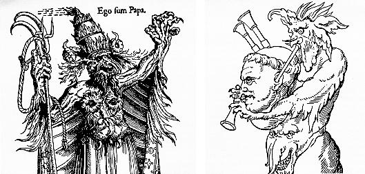 The Protestant Reformation of the 16th century devided the formerly unified Western church, giving rise to new, and often conflicting, religious and moral doctrines. As a result, Christians found it more and more difficult to agree on the “true” will of God or the intentions of nature. (Left) 16th century Prostetant caricature portraying pope Alexander VI. as the devil. (Right) 16th century Catholic caricature portraying Martin Luther a a bagpipe played by the devil.
