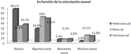 En cuanto al género, se han encontrado diferencias significativas (t(1226)=24.43; p<0.000) a favor de los hombres (74%) frente a las mujeres (14%). Por lo que respecta a la orientación sexual, se han encontrado diferencias significativas (F=16.771; p<0.000)