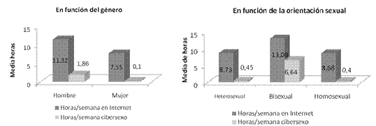 se conectan a páginas sexuales de Internet es de 0.66 (DT=4,62), encontrándose de nuevo diferencias significativas en función del sexo (t (1120)=5.546; p<0.000). Así, tal y como se puede ver en la gráfica 3, los hombres dedican una media semanal de 1.68 horas al sexo frente a las mujeres que le dedican únicamente una media de 0.10 horas semanales (ver gráfico 3). Por lo que respecta a la orientación sexual, se han encontrado diferencias significativas (F=36.928; p<0.000), siendo las personas que se declaran bisexuales las que más horas semanales le dedican al cibersexo. Así, son 6.64 horas las dedicadas por la población bisexual a consultar páginas sexuales de un total de 13.08 horas (DT=6.63) que están conectados a Internet durante la semana. Los heterosexuales dedican 0.45 horas (DT=3.05) de 8.73 horas (DT=11.71) que pasan en Internet a la semana. Y los homosexuales invierten 0.40 horas (DT=0.71) al cibersexo de 8.68 horas (DT=7.23) que dedican a Internet semanalmente.