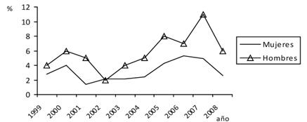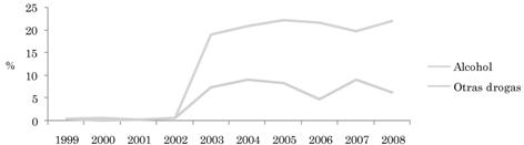 Como podemos observar en la figura 1, el consumo de alcohol antes o durante una relación sexual es superior al de otro tipo de droga a lo largo de todo el periodo de años que comprende el presente estudio. Sin embargo, cabe hacer referencia al porcentaje también significativo de personas que dicen haber mantenido relaciones sexuales bajo los efectos de otro tipo de drogas. A partir del año 2003 la prevalencia creció considerablemente respecto a años anteriores. Así, en el caso del alcohol, se obtiene una diferencia de un 0,4% en 1999 a un 19,1% en 2003 y, en el caso de otras drogas, de un 0,3% en 1999 a un 7,4% en 2003. El porcentaje continuó aumentando en ambos casos hasta el año 2004 en el que se obtuvo el pico más alto en el caso de otras drogas, con un 9% de la muestra que afirmaba haber estado bajo los efectos de drogas en su última relación sexual y hasta el año 2005 en el caso del alcohol, con un 22,3% de la muestra que apuntaba haber estado bajo los efectos de esta sustancia en su última relación sexual. Podemos seguir viendo en la figura que el porcentaje de relaciones sexuales bajo los efectos del alcohol a partir del 2005 ha ido disminuyendo mínimamente, volviendo la tendencia a aumentar en el año 2008. Por lo que respecta al consumo de otras drogas, también se observó un descenso a partir del 2004, aumentando considerablemente en el año 2007 hasta igualar el porcentaje obtenido en el año que se obtuvo el punto más alto. Los últimos datos de 2008 nos vuelven a sugerir una disminución en el porcentaje con respecto a años anteriores.