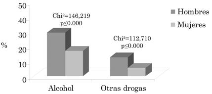 Si atendemos a la variable género (véase figura 2) de la muestra observamos que los hombres obtienen un porcentaje medio superior tanto en la frecuencia de consumo de alcohol (29,3%) como de otras drogas (12,7%) en su última relación sexual, con respecto a las mujeres (17% y 5,6%, respectivamente). Estas diferencias se muestran estadísticamente significativas realizando un Chi-cuadrado tanto en el caso del alcohol (Chi2=146,219, p≤0.000) como de otras drogas (Chi2=112,710, p≤0.000).