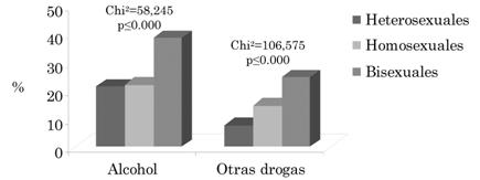 Figura 3. Frecuencia de relaciones sexuales bajo los efectos del alcohol y otras drogas en función de la orientación sexual y prueba Chi-cuadrado