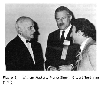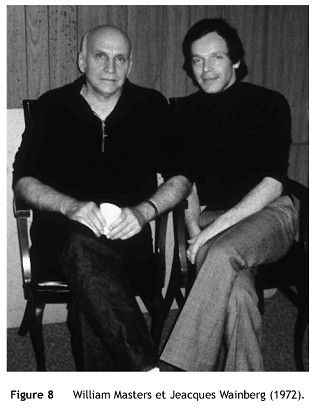 Waynberg quitte le directoire de la SFSC en 1976, et fonde l’institut de sexologie (www.sexologie-fr.com) le 21 mai 1977. Il a effectué une vingtaine de séjours aux États-Unis dont deux stages de longue durée, l’un auprès de Paul Gebhard, successeur de Kinsey à l’université de Bloomington, l’autre auprès de William Masters, dont il fut le premier élève français (Fig. 8). À l’époque, l’institut représente le second « courtier » de la sexologie française et participe, à l’instar de la SFSC, au déploiement à l’étranger de ses acquis dans trois secteurs de compétence : l’apprentissage de la médiation audiovisuelle en thérapie, la prise en charge des personnes handicapées (1981) et les recherches ethnopharmacologiques (lauréat de la Fondation de France en 1988). Un fond documentaire considérable s’inspire du modèle de l’institut Kinsey ; il sert d’appui à un cycle de deux années de formation continue auquel nombre de meneurs de la nouvelle vague doivent leur initiation à la sexologie. Cet enseignement pluridisciplinaire, ouvert à parité aux médecins et non-médecins, sera accueilli par l’université Paris-VII en 1999 sous forme d’un diplôme d’université (DU) de troisième cycle : « Sexologie et santé publique ».