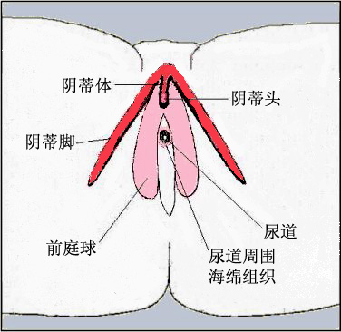組成。海綿體能迅速地充滿血液,由此導致整個器官變硬和擴大尺寸。陰蒂體進一步向內,分成兩隻腳,每一隻腳在陰道的兩側與前庭球相毗鄰,而且所有這些結構在性刺激下都會膨大。環繞尿道海綿體的海綿組織也是這樣。 |