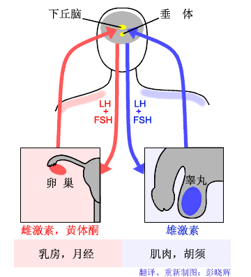 “性激素”的產生有一個回饋系統:在腦下部區域(下丘腦和垂體)的兩個腺體產生激素刺激性腺(卵巢和睾丸),反過來,性腺也影響著這兩個腺體。女性和男性的各種激素的綜合作用造就了兩個性別之間的次級性徵和其他各種差別。