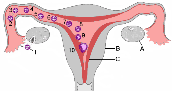 Size and dimensions of various elements in this drawing have been exaggerated for the purpose of illustration. 1 Ovulation 2-4 Fertilization 5-8 Segmentation 9-10 Implantation A: Ovary B: Uterus C: Endometrium