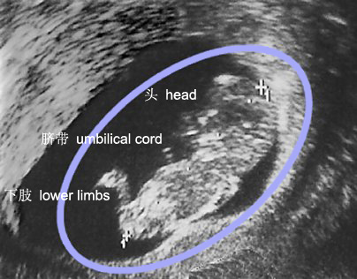 對妊娠三個月的孕婦做超聲波檢查所得超聲波圖像顯示一個男性胎兒(可以清楚地看到頭、軀幹和腿顯示在蘭色橢圓框內)。 This sonogram, taken in the third month of pregnancy, shows a male fetus (head, body and legs are clearly recognizable inside the blue oval).