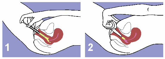 使用殺精子製劑:1.用塗藥器推送陰道泡沫劑;2.放置陰道殺精子栓劑。 Using spermicides. 1. Inserting spermicidal foam with an applicator. 2. Inserting a spermicidal suppository.