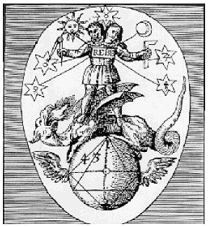 女人)的形象。勿需深入分析此處所繪插圖的每一個神秘細節,您就可以清楚地認出一個雙性人,他佩戴著太陽(sun-自拉丁語sol)、黃金的符號,在他的另一邊則有月亮(moon自拉丁語luna)和銀的符號。這個雙性人代表著心靈的精確平衡,他站跨在有翼的巨龍之上,代表著已經昇華的人類情欲。這條巨龍依次躺在有翼的地球上,代表著已經開竅的靈魂,等等。整幅圖畫因而利用煉金術的符號舉例說明盡善盡美的精神昇華過程。這種盡善盡美之一部分卻是男女要素的融合物。