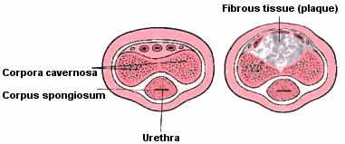 fibrous, ineleastic scar tissue (plaque), usually on top of the two upper erectile bodies inside the penis (the corpora cavernosa). In consequence, the penis is no longer elastic enough for a normal erection, but bends upwards and/or sideways. The erection, such as it is, may also be painful. In some cases, the plaque also develops on the underside of the penis, in which case it will bend downward.The degree of the curvature may, over time, vary from slight to very great. Depending on the progression of the disease, sexual intercourse may become difficult or impossible. The condition may appear rather quickly as a result of some injury to the penis, but most often it develops slowly in men of middle age. However, there have also been cases in very young and very old men. About 0,1 % of all men over 40 seem to be affected.