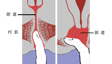 Feeling the Pubococcygeus (PC muscle). Normal PC muscle tone: When the top half of the index finger is inserted into the vagina and then moved about, it feels resistance in all directions. The woman can voluntarily contract the muscle. (left) Weak of absent PC muscle tone: The middle third of the vagina is roomy, and the vaginal walls feel as if they were detached from their surroundings. The woman cannot voluntarily contract the muscle. (right) Schematic drawings after Kegel's own illustrations.
