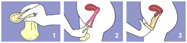 插入女用安全套:1.在安全套封闭的一端将环压拢;2.食指进入安全套,将它顶入阴道;3.安全套封闭的一端达到正确的位置,盖住子宫颈,而其开口端仍留置在阴户之外。 Inserting the female condom. 1. The ring at the closed end is squeezed together for insertion.2. Using the index finger inside the condom, it is inserted into the vagina.3. The closed end of the condom has reached its correct position closed to the cervix, while the open end remains visible outside the vulva.