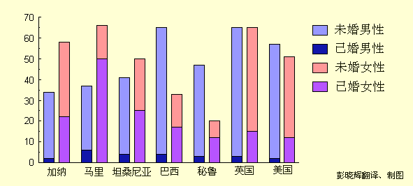 如柱状图所示,在成年以前青少年发生性交的百分比较高。许多人未婚,未婚男孩尤甚。 As the graph shows, a high percentage of teenagers has had sexual intercourse before reaching adulthood. A great many of them are unmarried, especially the males.