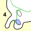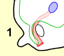 当男胎在子宫内发育的时候,他的睾丸会逐渐降入发育中的阴囊。此处所示为在导向组织索的协助下正在降入阴囊的睾丸(兰色):