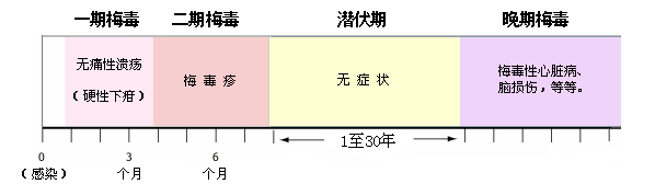 本图表概述未经治疗梅毒的疾病发展过程:1.一期梅毒:通常在感染的部位仅有一个溃口或溃疡。2.二期梅毒:皮疹、毛发脱落和流感样症状出现。3.潜伏期:可延续1-30年;无外在症状。4.晚期梅毒:严重地损害心脏、脑和其他内部器官。最终可导致死亡。但是,多半的感染者决不会进入梅毒的此期病程。