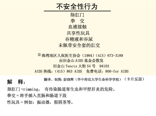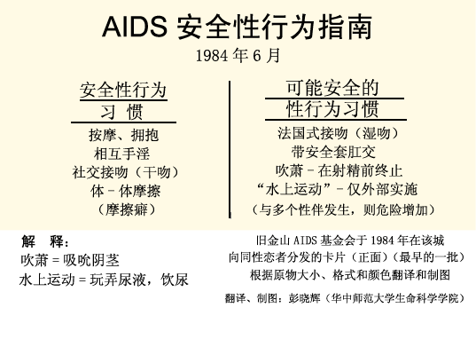 Bay Area Physicians for Human Rights (BAPHR), very early on recommended the use of condoms. When, several years later, AIDS made its appearance, this recommendation was expanded to cover a variety of sexual contacts in detail. These first “AIDS Safe Sex Guidelines” were widely disseminated all over the city, for example in the form of small cards that could be carried in a wallet or shirt pocket. The guidelines differentiated between “safe”, “possibly safe”, and “unsafe” sexual practices and thus pursued two main goals: 1. To counteract a growing panic by creating an awareness of the different degrees of risk. 2. To provide some reassurance that these risks did not have to mean the end of all sexual contact. The strategy worked in San Francisco, because its gay community was sophisticated enough to accept the differentiations. It did not always work elsewhere. In communities that considered the guidelines too complicated, they were replaced by the earlier simple advice to use condoms.