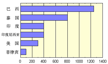 按照联合国儿童基金会的估计,世界范围内大量的儿童被性剥削。本图表显示6个国家的儿童卖淫者的数量。估计巴西的数量在50万到200万之间。此处显示的是平均数。