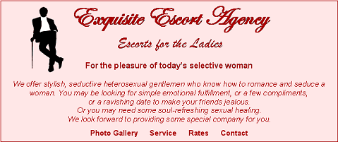 Some agencies offer escorts simply as social companions, but others also appeal to the sexual interests of their female customers. Their escorts provide sexual services as well. Shown here is a simplified composite of several web sites. (In order to avoid easy identification, the name and the design have been changed. However, the text is authentic.) |