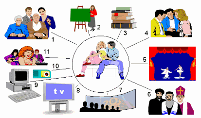 Some sources of sexual scripts Some of the sexual scripts being offered to young people in our culture are competing with each other or are even mutually exclusive. Shown here are only a few examples. (Clockwise from top left): 1. Family 2. School 3. Books 4. Friends 5. Theater 6. Religious leaders 7. Movies 8. Television 9. Internet 10. Radio 11. Popular music |