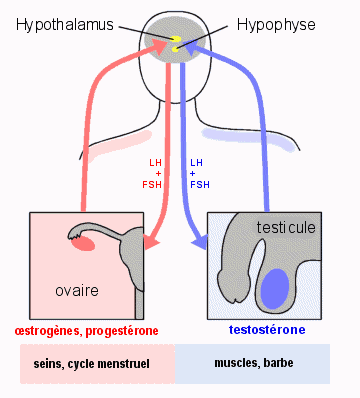 Production des hormones sexuelles - système feedback : Les 2 glandes dans la partie inférieure du cerveau (Hypothalamus et hypophyse) stimulent les gonades (ovaires et testicules) qui eux-mêmes influencent les stimulateurs dans ces derniers. Ces différentes « mixtures » d’hormones permettent le développement des caractères sexuels secondaires chez la femme et l’homme.