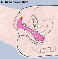 Tumescence: Durant l’excitation, les organes sexuels s’engorgent de sang et gonflent. Ils deviennent tumescents (lat. tumescere: se gonfler) et suscitent la lubrification du vagin. En réponse à la stimulation sexuelle, les parois du vagin transsudent une substance claire, qui le prépare au coït. Sans cette lubrification, la pénétration du pénis serait douloureuse pour les deux partenaires. (Chez l’homme, l’indicateur de la tumescence est l’érection du pénis).