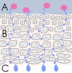 À gauche : la transpiration » (transsudation) des parois vaginales. À droite : Plexus veineux vaginaux et substance claire (A), paroi musculaire du vagin (B), « sueur » lubrifiante (C).