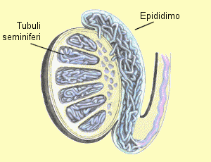 Epididimo Gli spermatozoi, prodotti nei tubuli seminiferi, si muovono verso i tubuli di raccolta (epididimo), lunghi circa 6 metri, localizzati sulla superfice di ogni testicolo. Esso è arrotolato e sembra avere la stessa lunghezza del testicolo. Uno spermatozoo necessita di diverse settimane per attraversare i tubuli di raccolta. Durante questo periodo, esso acquista una certa capacità di movimento. |