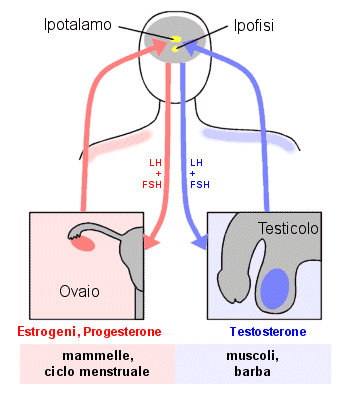 La produzione degli ormoni sessuali è un sistema feedback: due ghiandole, ipotalamo ed ipofisi, localizzate nella parte più bassa del cervello, stimolano le gonadi (ovaio nelle donne, testicolo nel maschio) che a loro volta influenzano i loro stimolatori. I diversi livelli d’ormoni, nell’uomo e nella donna, determinano i caratteri sessuali secondari cosi come altre differenze tra i due sessi.