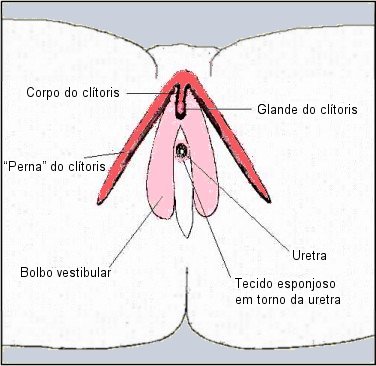 O clítoris A extremidade ou glande do clítoris (gr. Kleitoris: pequena elevação) localiza-se inferiormente ao Monte-de-vénus no local em que os pequenos lábios se unem, formando um prepúcio. Visível externamente debaixo deste prepúcio, encontra-se a glande do clítoris. O corpo clitoriano é um órgão pequeno e cilíndrico composto principalmente de tecido eréctil, i.e., de dois corpos esponjosos (lat. Corpora cavernosa) que se enchem rapidamente com sangue causando assim a intumescência e aumento de tamanho de todo o órgão, sob estimulação sexual. Isto também se aplica ao tecido esponjoso que rodeia a uretra.