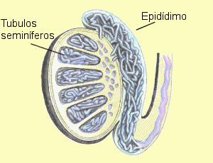 Secção longitudinal de um testículo mostrando os tubulos seminíferos e o epidídimo. |