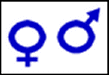 Símbolos biológicos de sexo feminino e masculino Esquerda: fêmea (Vénus? Espelho de mão? Vulva?) Direita: macho (Marte? Arco e flecha? Pénis e testículos?)