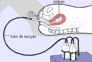 Curetagem de sucção Um instrumento é fixado ao colo do útero, a fim de o segurar na posição, e um tubo de sucção é então inserido através do colo dilatado do útero, sugando o embrião para dentro de uma garrafa.