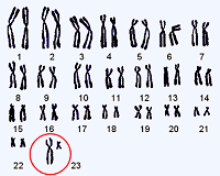Da esquerda: 1. Masculino típico (um cromossoma X-, um cromossoma Y) 2. Mulher com Síndrome de Turner (apenas um cromossoma X) 3. Homem com Síndrome de Klinefelter (dois cromossomas X, um cromossoma Y) Para aumento, clique em cada cariograma.
