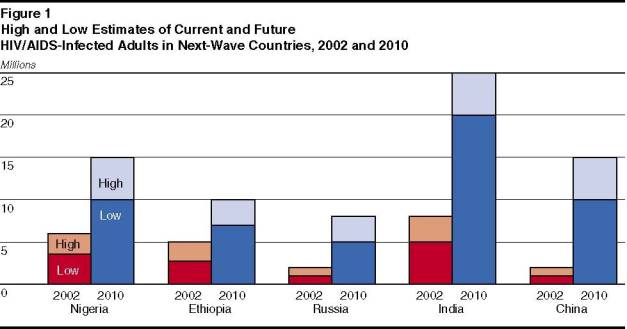 ·        We project China will have 10 to 15 million HIV/AIDS cases, and India is likely to have 20 to 25 million by 2010—the highest estimate for any country.  By 2010, we project Nigeria will have 10 to 15 million cases, Ethiopia 7 to 10 million, and Russia 5 to 8 million.