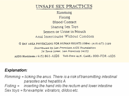 1984: cartões de bolso, distribuídos pela SF AIDS Foundation, frente e verso. (Clique na figura)