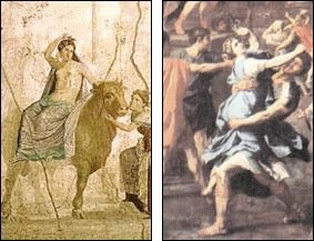 Violação na antiga mitologia grega e romana. (Esquerda) “A violação de Europa”: para se aproximar da princesa, Zeus assumiu a forma de um touro. Quando ela subiu para as suas costas, ele raptou-a. Detalhe de uma pintura em parede em Pompeia, seculo I AD (Para raptar Ganimedes, Zeus assumiu a forma de uma aguia) (Direita) “A violação de mulheres sabinas “. Detalhe de uma pintura de Nicolas Poussin (1594–1665) |