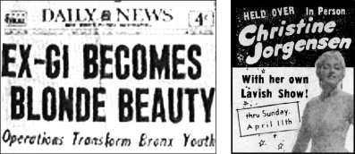 Christine Jorgensen (1926 –1989) foi o primeiro transsexual a tornar-se uma celebridade internacional Esquerda: cabeçalho de jornal. Direita: Anuncio de jornal para o seu show. |