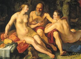 ”Lot e suas filhas” Na história bíblica do viúvo Lot, as suas duas filhas fizeram-no beber, porque queriam engravidar dele e assim continuar a linha familiar. Ambas conseguiram e cada uma deu à luz um rapaz. Pintura de Hendrik Goltzius (1558-1617)