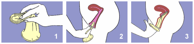 Использование женского презерватива. 1. Для введения во влагалище сожмите кольцо, расположенное на закрытом конце презерватива. 2. Поместите указательный палец внутрь презерватива и введите его во влагалище. 3.