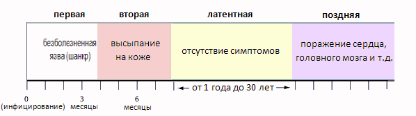 график демонстрирует четыре сменяющие друг друга стадии сифилиса и
