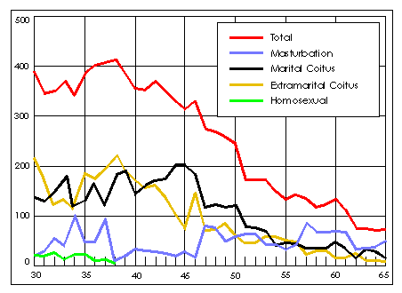 В приведенном ниже графике иллюстрируется возрастной спад сексуальной активности на примере одного мужчины. В документе указаны различные виды сексуальных контактов, происходящих за год. Он несет в себе особую информативную ценность, так как сексуальная жизнь данного мужчины была нетипичной во многих отношениях. Тем не менее, с возрастом уровень сексуальной активности этого человека стал приближаться к мерке, характерной для всех мужчин в этом возрасте.
