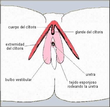El clítoris La punta o glande del clítoris (el gr. kleitoris: elevación pequeña) esta localizada debajo del Monte de Venus en el punto de encuentro de las labias minoras que forman el prepucio. Externamente visible bajo este prepucio esta el glande del clítoris. El cuerpo del clítoris es un órgano cilíndrico corto compuesto principalmente del tejido eréctil y de dos cuerpos esponjosos (el Lat. Corpora cavernosa) que pueden llenarse rápidamente con sangre y así causar que el órgano se endurezca y crezca en tamaño. Siguiendo hacia adentro, el cuerpo del clítoris se divide en dos extremidades, cada uno de las cuales se adhiere junto a un bulbo a cada lado de la vagina, y todas estas estructuras se hinchan bajo estímulo sexual. Esto también ocurre con el tejido esponjoso que rodea la uretra.