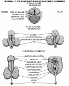 Desarrollo macho típico En el embrión macho la joroba se convierte en el pene, y la ranura se cierra. Otra masa de células se convierte en los testículos que comienzan a producir la hormona testosterona. Esta hormona, a su vez, estimula crecimiento adicional y diferenciación. (Sin esta, el embrión " en forma automática " se desarrollara en una hembra.) Dos masas de la piel en uno u otro lado de la joroba forman el escroto. Entre el séptimo y el noveno mes de embarazo, los testículos descienden al escroto. (Si no logran descender, corrección quirúrgica es requerida posteriormente a fin de impedir infertilidad.) Al nacimiento, los órganos sexuales externos e internos se definen claramente como varón.