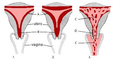 Clave: A. Endometrio B. Tapón mucoso cervical C. Endometrio separado siendo descargado D. Área destapada.