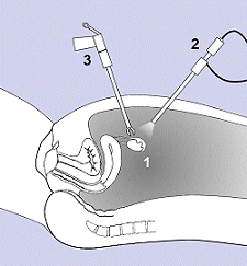 Laparoscopia Se puede utilizar la laparoscopia para dos casos, para diagnosticar y también para tratar la endometriosis. Como tratamiento, no sólo se remueve una muestra pequeña pero también se puede remover el tejido endometioso. Esta gráfica ilustra el primer caso. Muestra la cavidad abdominal llena de gas (1), la laparoscope iluminando con su luz uno de los dos ovarios (2), y la sonda (3). |