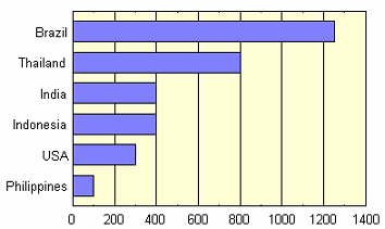 Prostitución infantil en algunos países (en miles) De acuerdo a los estimados de la UNICEF, un gran número de niños alrededor del mundo son explotados sexualmente. Este grafico muestra el número de niños prostituidos en seis países. El estimado para Brasil está entre 500.000 y 2 millones. Aquí se muestra la media. Fuente: UNICEF |