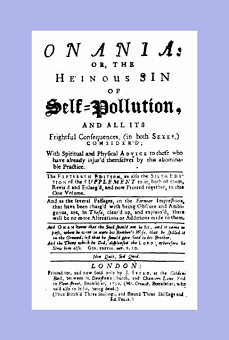 En 1710, apareció un volante anónimo en Inglaterra con el título, "Onania o el atroz pecado de la auto-contaminación y todas sus terribles consecuencias en ambos sexos, considerado con consejos espirituales y físicos para aquellos que ya han sido perjudicados por esta práctica abominable". Ahora se cree que el autor era un clérigo que se volvió charlatán que le ofreció a sus lectores un refrito de viejas teorías embellecido sobre los peligros de "perder" semen. Llamó a este comportamiento "Onania", en referencia a Onán, un personaje bíblico que fue castigado por Dios por negarse a impregnar la viuda de su hermano. Como es requerido por la costumbre, se involucró en el coito con ella, pero evitó cualquier posible embarazo mediante la práctica del método del coito interrumpido como método anticonceptivo (Génesis 38:8-10). Por desgracia, las ideas absurdas del autor y sus términos engañosos pronto encontraron una gran aceptación. El folleto fue rápidamente traducido a varios idiomas europeos y, finalmente, fue a través de más de ochenta ediciones.