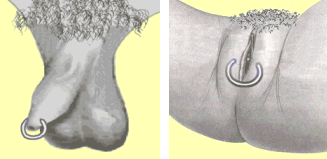 Infibulación En la antigüedad, y en ocasiones en los tiempos modernos, hombres y mujeres eran infibulados, es decir, se colocaba un anillo a través de sus órganos sexuales externos para prevenir que tuvieran relaciones sexuales. El término "infibulación" se deriva del latin. fibula: o enganchar. (Derecha) Pene Infibulado. (Izquierda) Vulva Infibulada. |