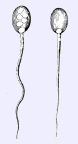 (Vlevo) Vlastní kresba A. van Leeuvenhoeka zobrazující spatřenou spermii. (Vpravo) Kresby ostatních vědců po objevu A. van Leeuvenhoeka. Před objevením ženské pohlavní buňky (vajíčka) se mnozí vědci domnívali, že hlavička každé spermie obsahovala již „předpřipraveného malého člověka“ (homunculus).