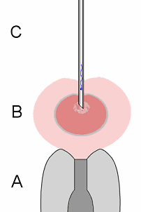 A: Trubička přidržující vajíčko B: Vajíčko C: Jehla obsahující spermii